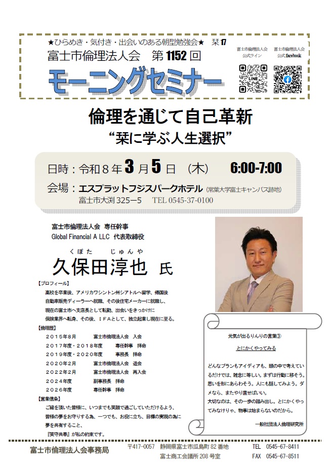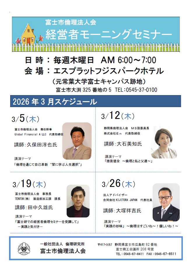 「富士市倫理法人会」では、富士市を中心とした企業の経営者が、「活力朝礼」をメインに明るく前向きに倫理の実践に取り組んでいます。